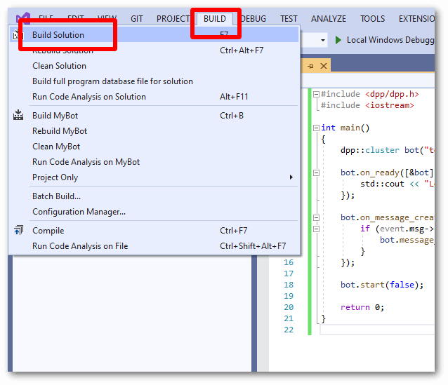 • If you get an error that a DLL is missing (e.g. dpp.dll or opus.dll) when starting your bot, then simply copy all DLLs from the bin directory of where you extracted the D++ zip file to, into the same directory where your bot's executable is. You only need to do this once. There should be several of these DLL files: dpp.dll, zlib.dll, openssl.dll and libcrypto.dll (or similarly named SSL related files), and opus.dll.