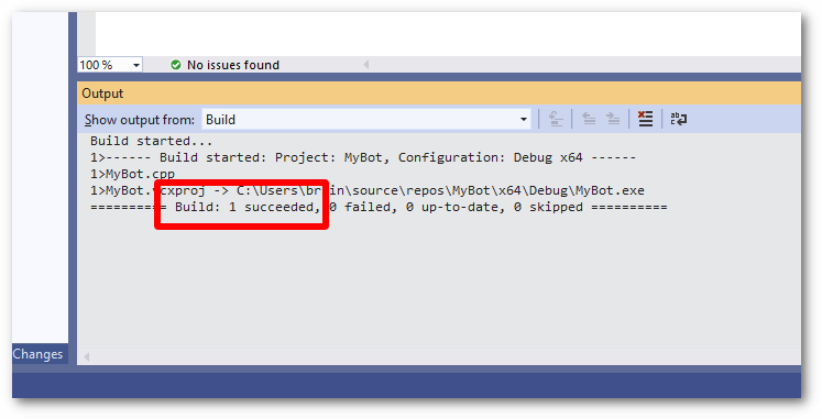 15. Observe the build output. There may be warnings, but so long as the build output ends with "1 succeeded" then the process has worked. You may now run your bot!