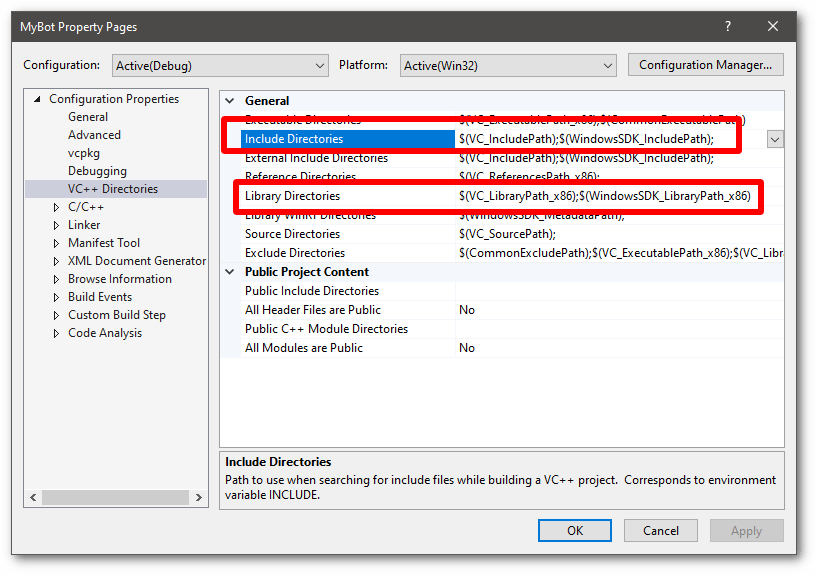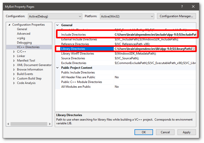 7. The next step is to populate the include directories and library directories sections with the paths to the D++ library and include files. The next steps will guide you through how to do this.