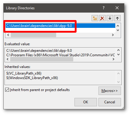 9. Going back to the previous window, now edit the library paths. Again click 'edit' when prompted to edit the library paths section. Add the path to the library folder you extracted to your machine, which we took note of earlier. Note that once more it is important to add the dpp-10.0 folder within it, not any other folder, to this list. Also be aware this is a different folder than the one you just added for includes!